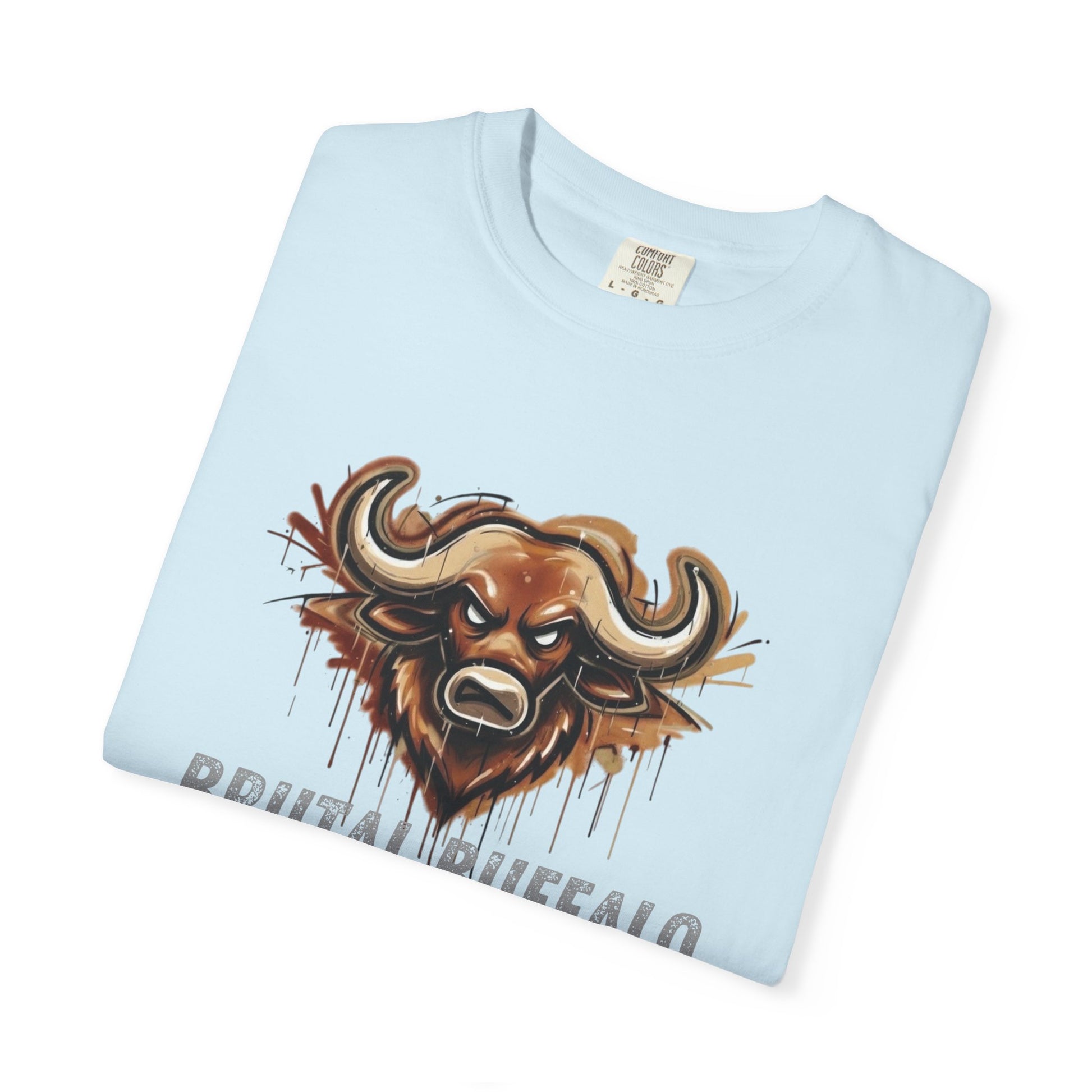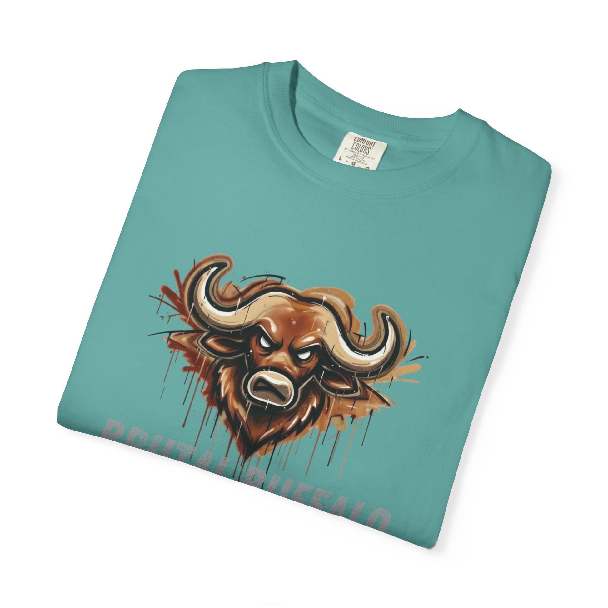 This heavyweight garment-dyed tee carries a raw, untamed energy. A bold buffalo head bursts across the chest in rich, painterly strokes, the text ‘BRUTAL BUFFALO’ grounding the design with grit. The shirt’s soft, garment-dyed finish gives the color depth and a lived-in feel that gets better with every wash. Wear it when you want a confident, outdoorsy look that reads authentic rather than staged. It’s roomy enough for layering but structured enough to hold the graphic’s presence — the kind of staple you reach for when you want to feel steady and unmistakable at a bonfire, on a trail, or out with friends.